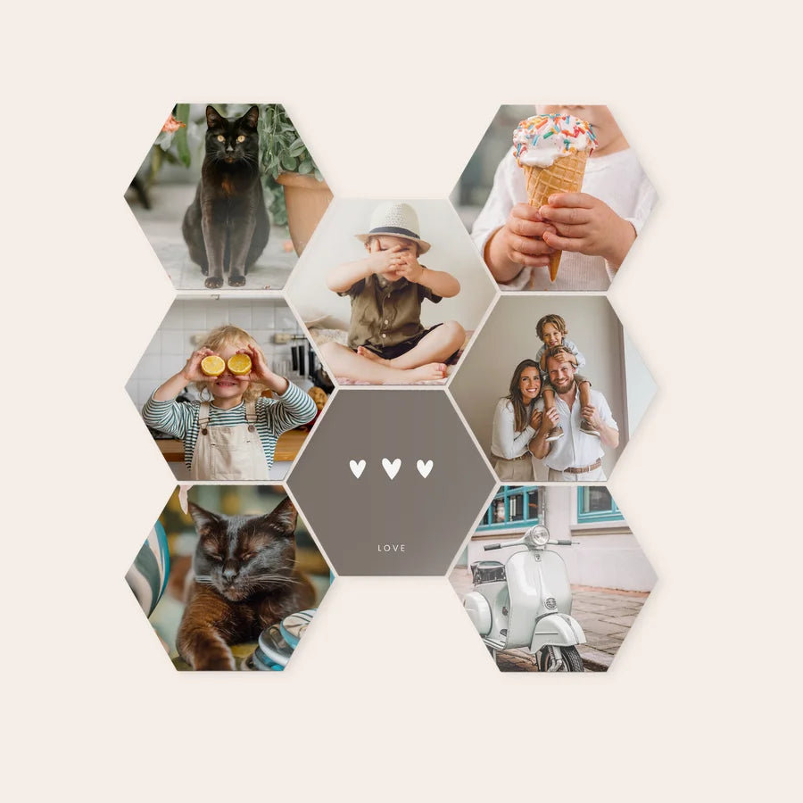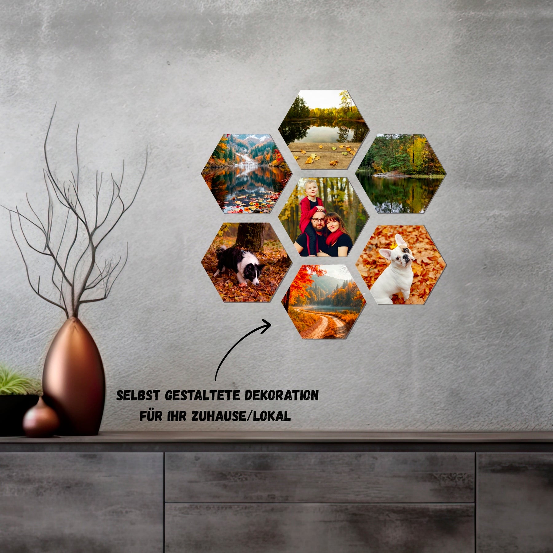Erhältlich in drei Formen – Hexagon, Quadrat oder Rechteck – lassen sich die Kacheln flexibel kombinieren und ganz einfach mit Spezialkleber anbringen. So wird Ihre Wand zur Galerie Ihrer schönsten Momente.